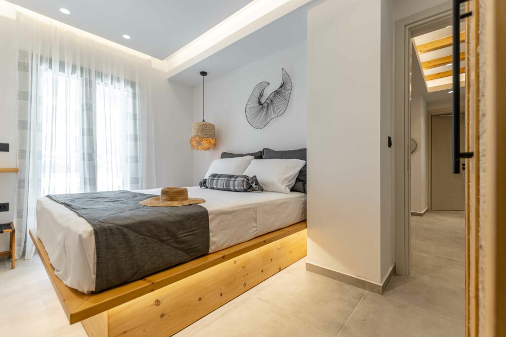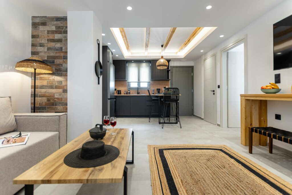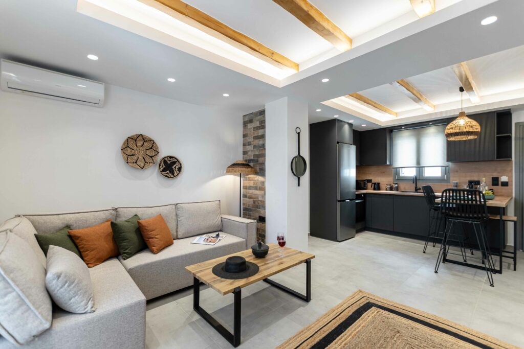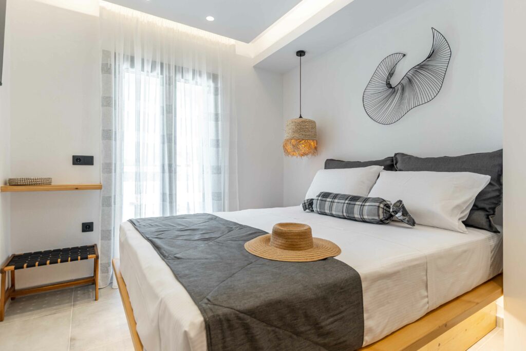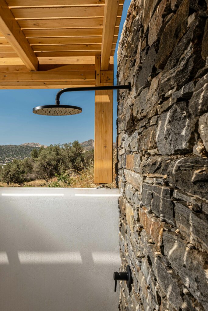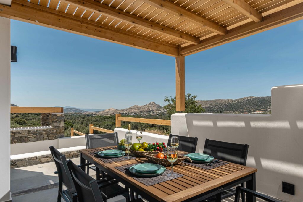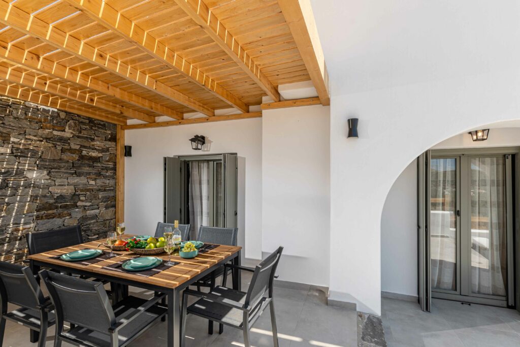 Our accommodation suite has an area of 53 sq.m. and provides its guests with all the necessary indoor and outdoor amenities. The indoor accommodation for up to four people consists of a master bedroom with a queen size bed, a fully equipped kitchen connected to the living room and a spacious bathroom with shower. The outdoor area from the living room consists of a veranda with an outdoor modern pergola for shade with a comfortable seating area and an outdoor shower.