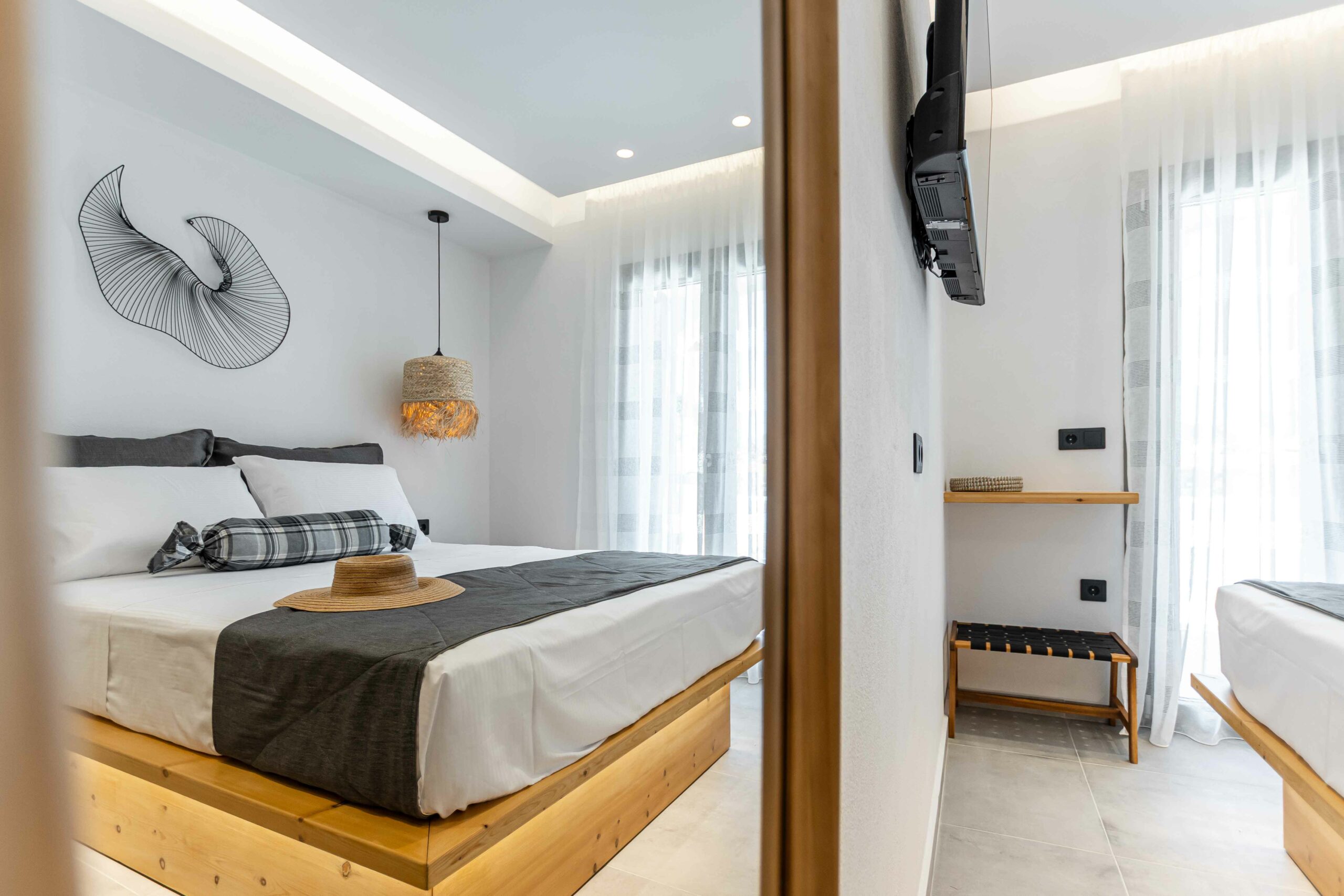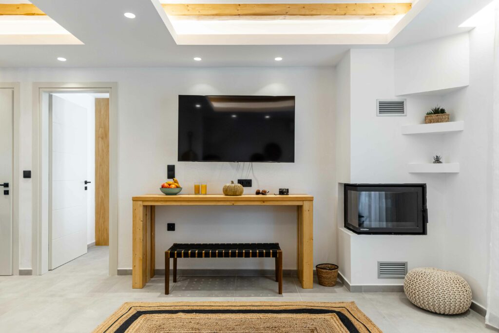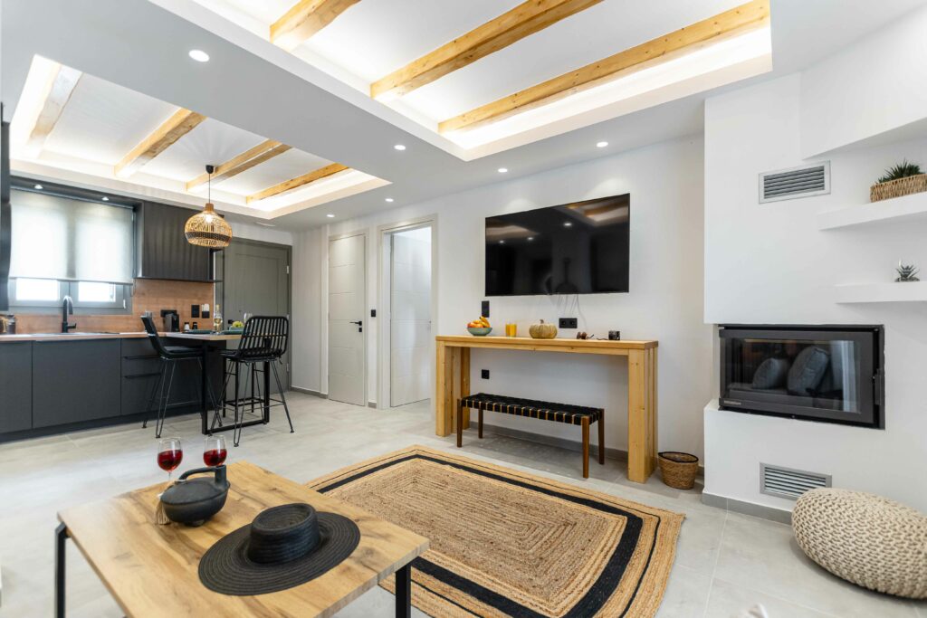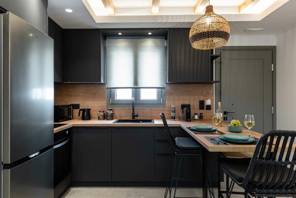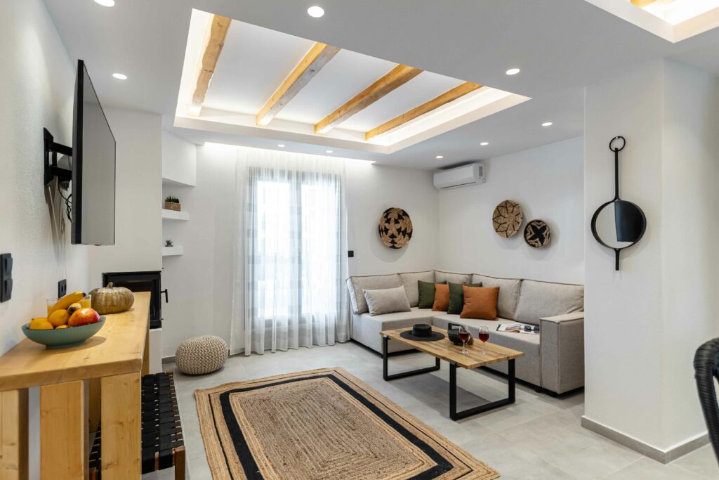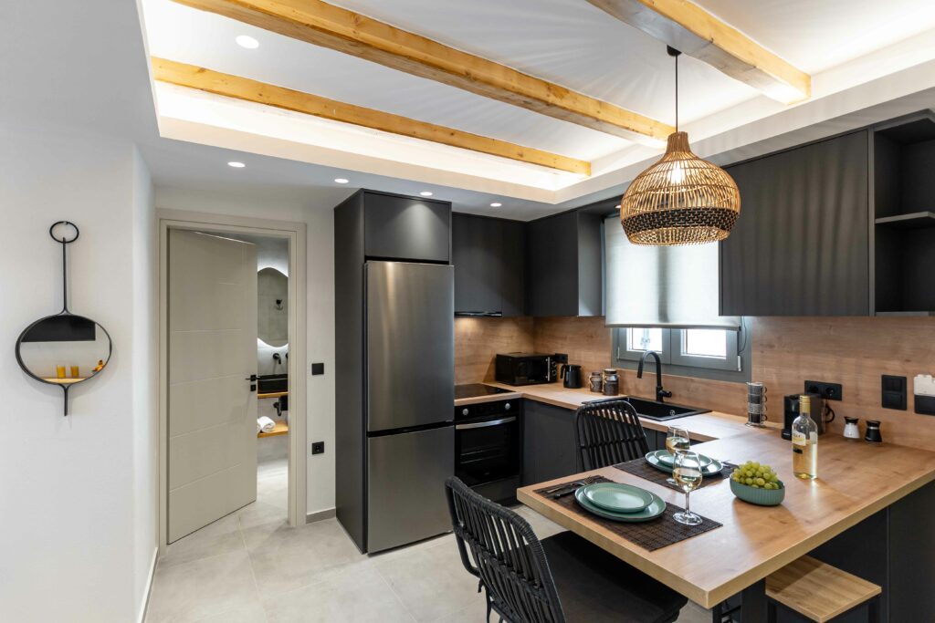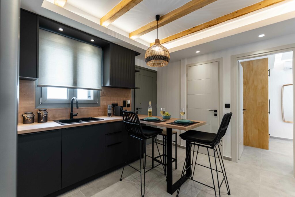 Our accommodation suite has an area of 53 sq.m. and provides its guests with all the necessary indoor and outdoor amenities. The indoor accommodation for up to four people consists of a master bedroom with a queen size bed, a fully equipped kitchen connected to the living room and a spacious bathroom with shower. The outdoor area from the living room consists of a veranda with an outdoor modern pergola for shade with a comfortable seating area and an outdoor shower.