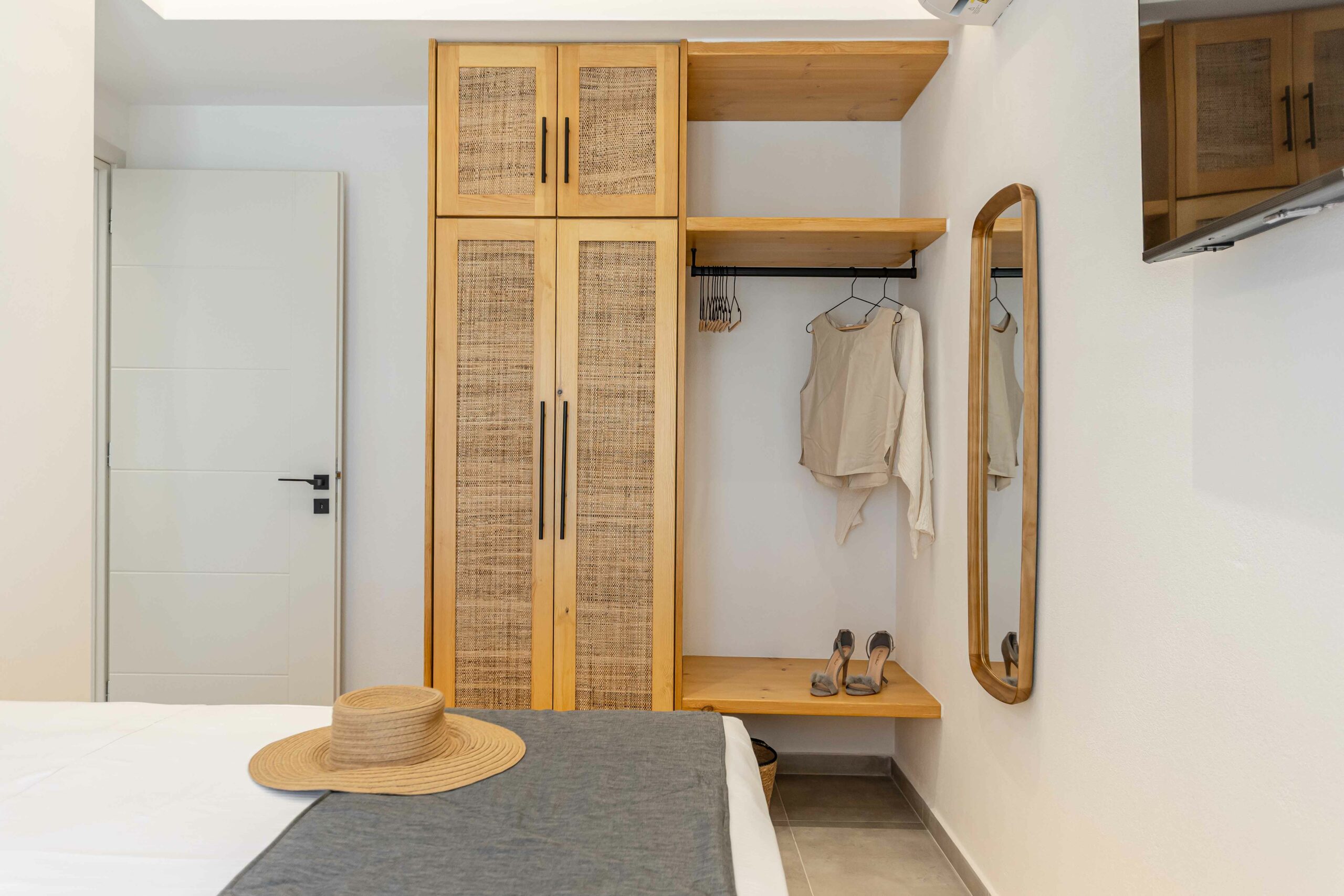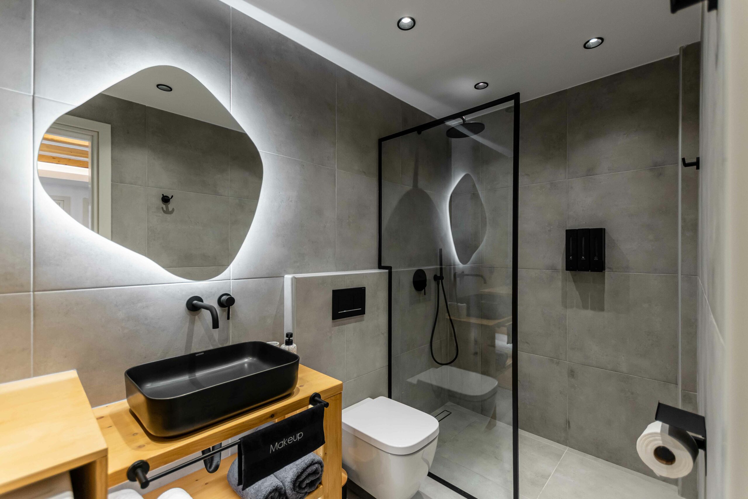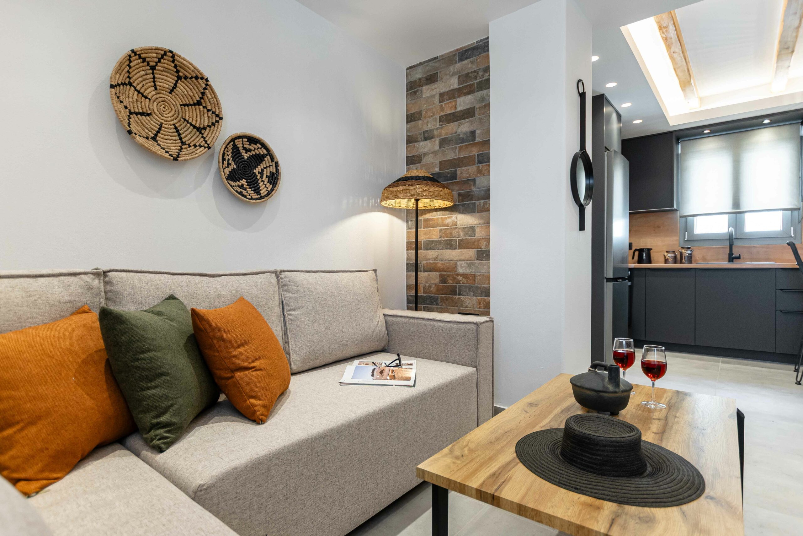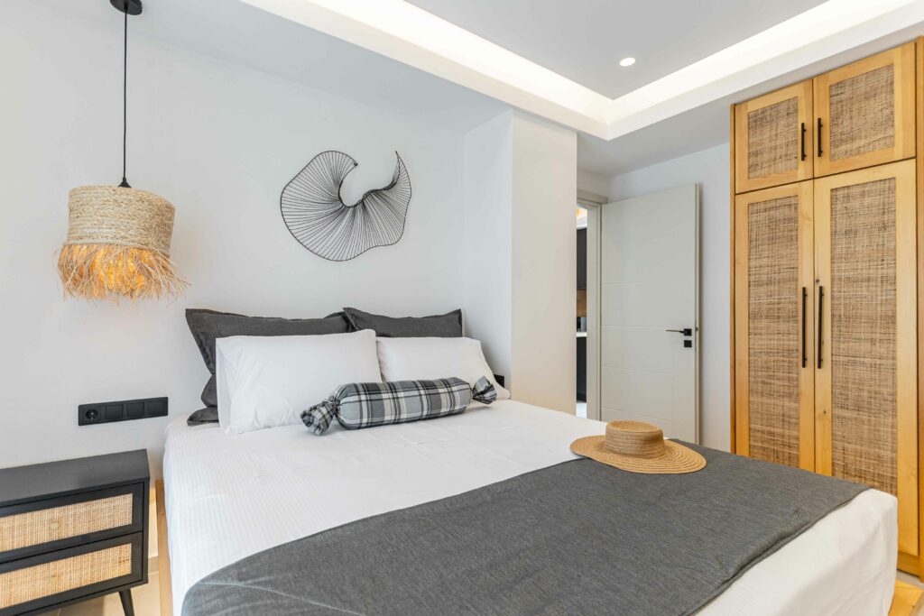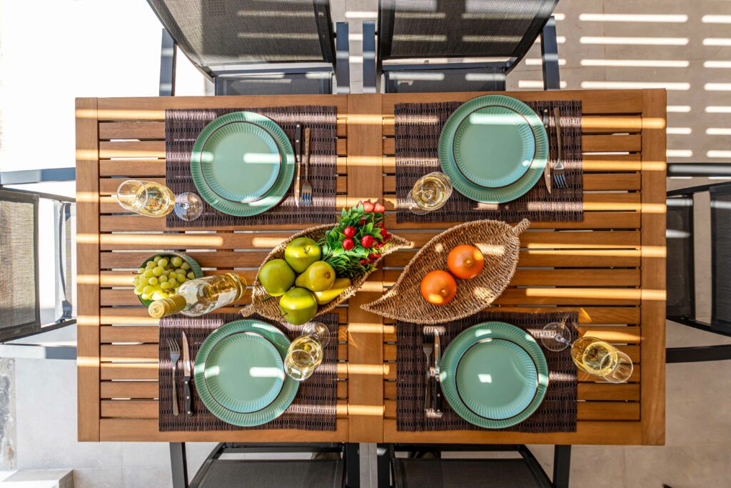 Our accommodation suite has an area of 53 sq.m. and provides its guests with all the necessary indoor and outdoor amenities. The indoor accommodation for up to four people consists of a master bedroom with a queen size bed, a fully equipped kitchen connected to the living room and a spacious bathroom with shower. The outdoor area from the living room consists of a veranda with an outdoor modern pergola for shade with a comfortable seating area and an outdoor shower.